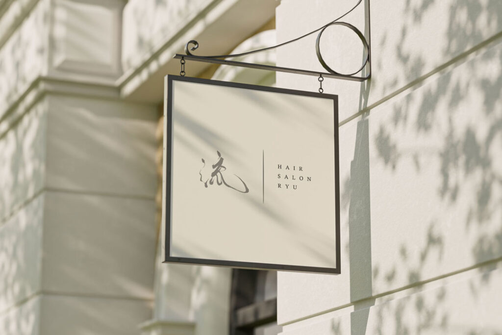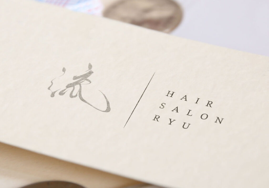 欧文の「HAIR SALON RYU」は、毛筆文字の雰囲気を邪魔しないよう、すっきりとした書体を選び、全体が静かにまとまるよう配置しました。和と洋を無理に混ぜるのではなく、自然に並ぶ関係性になるよう心がけています。